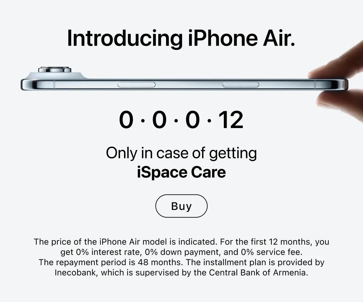iSpace, with official Apple Premium Reseller status, is an international retail chain of premium Apple stores and service centers, where everything meets the brand standards. We cooperate directly with Apple — all equipment is original: it has an official guarantee and full support. We have an online store with countrywide delivery, and there are three retail locations in Yerevan.